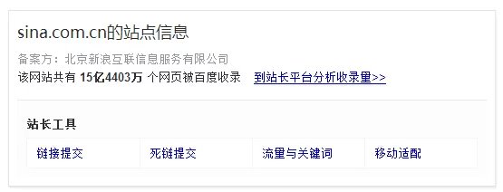 收錄量:通常我們認(rèn)為的網(wǎng)站量指通過site指令可以查詢到的網(wǎng)頁數(shù),如“site:sina.com.cn”,我們認(rèn)為此刻sina.com.cn的百度收錄量為15億4403萬。一般我們認(rèn)為收錄量越高的網(wǎng)站權(quán)重相對(duì)會(huì)更高,越容易在一些關(guān)鍵詞的排名上有好的表現(xiàn)。